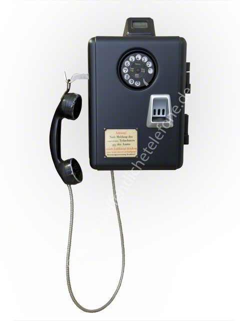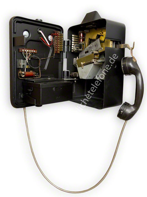Der Münzfernsprecher besteht aus einem mattschwarz lackierten Gehäuse mit Geldeinwurfschlitz für 10 Reichspfennig-Stücke, dem Sperrnummernschalter, Handapparat, der Kassiervorrichtung und dem Geldbehälter.