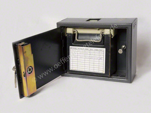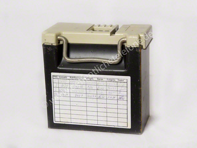 - Der Geldbehälter (Münzkassette) besteht aus einem Stahlblechkasten mit Tragegriff und einem Kunststoffdeckel. Mit Hilfe eines Riegels, der über einen Metallwinkel am Deckel zu schieben ist, kann der Geldbehälter verschlossen und in dieser Stellung plombiert werden. Die quadratische öffnung im Deckel ist bei dem herausgenommenen Geldbehälter durch einen Verschlußschieber im gespannten Zustand verschlossen.