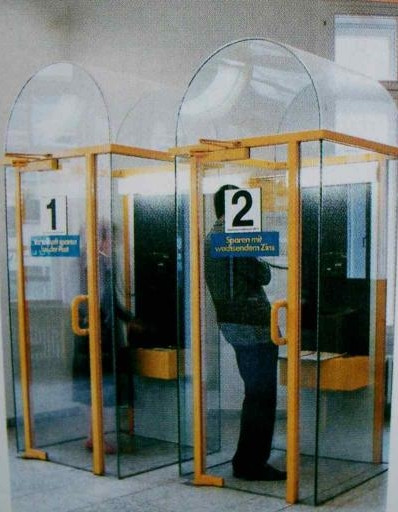 zwei TelZ Telefonzellen in einem Postamt der Deutschen Bundespost, 80er Jahre. Die TelZ waren ausgestattet mit gewöhnlichen Apparaten, in diesem Fall mit zwei Wandgeräten. Erfasst und bezahlt wurden die Telefongebühren nach dem Gespräch am Post/Brief-Schalter.